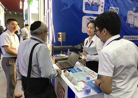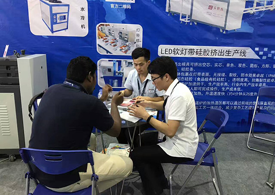 這是黄色视频免费网站的業務副總在為外國友人介紹黄色视频免费网站的LED軟燈帶擠出生產線,該產品為一次性擠出可達上千米,擠出的產品尺寸更標準,效率更高,完全解決客戶LED對擠出生產效率問題。