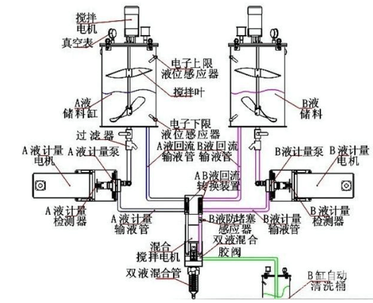 1、將AB膠水(雙組份膠水)分別裝到AB兩個料桶之中,通過桶下麵的泵體來控製膠量的大小,達到一定的配比。泵體 可根據用戶要求來選擇:齒輪泵,螺杆   泵、柱塞泵等,因各行業的膠水性質不一樣(有粘稠不一樣的,有膠水帶填 充物、膠水比例等),需要根據膠水來決定用那種計量泵會比較合適。