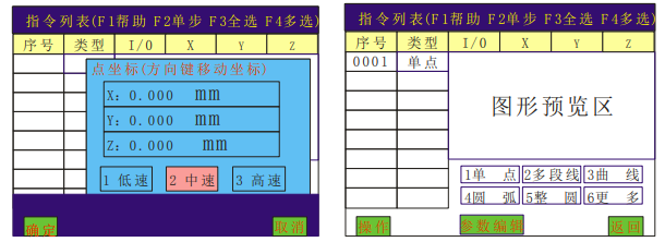 按數字鍵 1 直接進行點坐標教導,點的坐標可以通過方向鍵來移動 “左 X 鍵”X 軸左移、“右 X 鍵” X 軸右移,“上 Y 鍵”Y 軸上移、“下 Y 鍵”Y 軸下移,“上 Z 鍵”Z 軸上移、“下 Z 鍵”Z 軸 下移。按“確認”鍵新增指令成功。退出教導,直接按“返回”鍵,如圖所示: